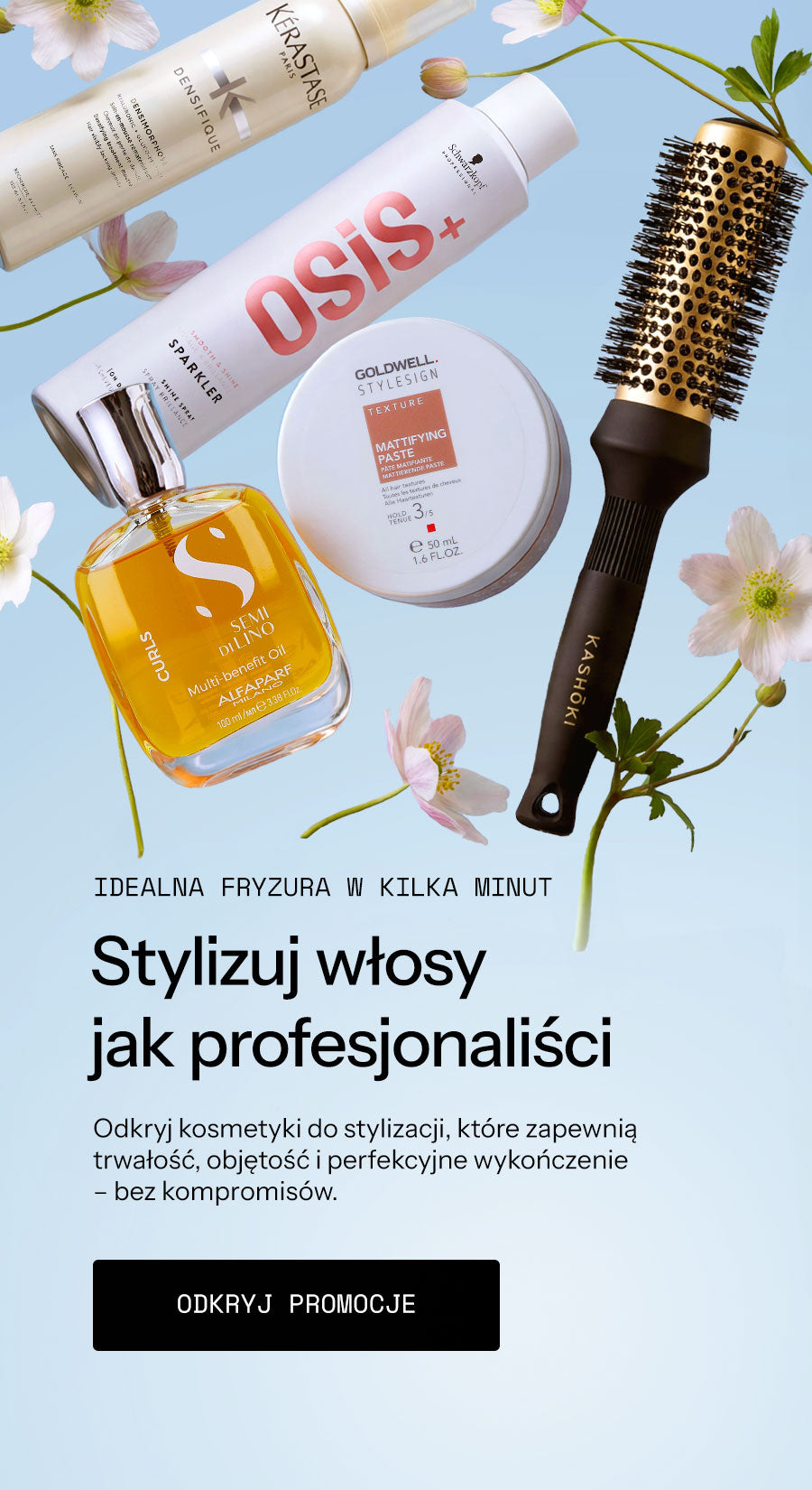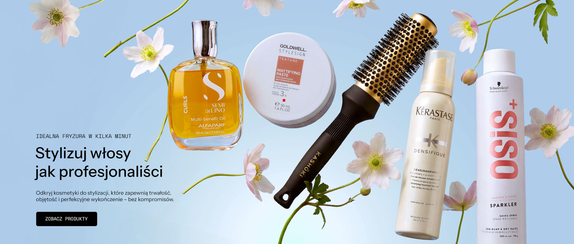 Witaj w świecie pięknych włosów! To tutaj pasma, pukle i kosmyki, fale i loki zyskują zupełnie nową jakość i blask. Dzięki profesjonalnym produktom do pielęgnacji, stylizacji i koloryzowania, potrafimy połączyć pasję do piękna, estetyki i doskonałości z najwyższą dbałością o zdrowie! Nasza oferta obejmuje wysokiej klasy innowacyjne kosmetyki do włosów, które spełniają wysokie standardy jakości i dedykowane są zarówno profesjonalnym fryzjerom, jak i klientom indywidualnym. Znajdziesz szeroki wybór doskonałych produktów, takich jak: szampony, odżywki, maski, olejki, lakiery, pianki, pasty, spraye, produkty do trwałej ondulacji, produkty do chemicznego prostowania włosów, preparaty do farbowania i czasowej koloryzacji, akcesoria fryzjerskie niezbędne do stylizacji włosów, urządzenia do stylizacji włosów.