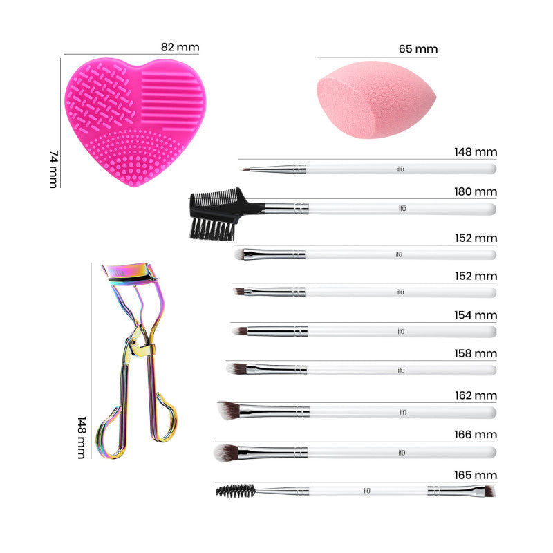 The More Than Meets The Eyes set contains everything you need to do an evening smokey eye or day makeup. You will find 9 precise eyelid and eyebrow brushes, and also our soft sponge and functional brush cleaner. Plus, to make you even more happy, you'll also find a rainbow eyelash curler in the set!