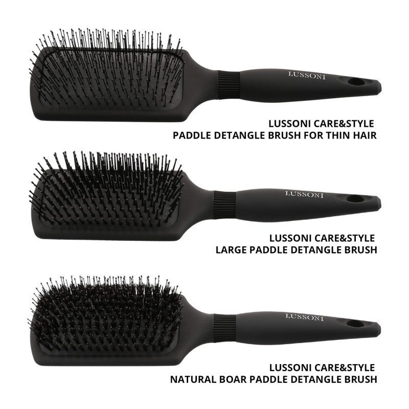 - LUSSONI Care & Style Paddle Detangle Brush – Ideal for detangling all hair types and lengths. The nylon pins with ballpoint tips gently separate hair strands while massaging the scalp.