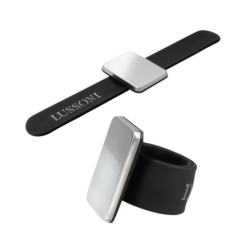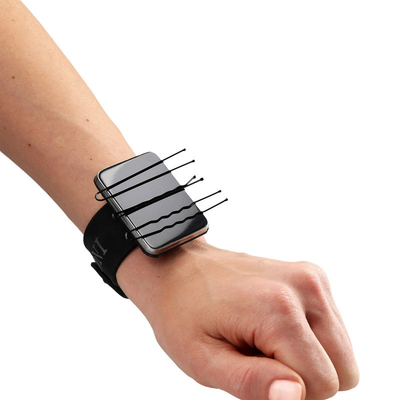 The magnetic band is a practical accessory that makes hairdressers' work easier and faster. It keeps pins and grips within easy reach at all times. It is equipped with a self-gripping durable bracelet to fit any wrist.