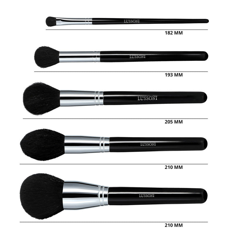 The Lussoni makeup essentials set consists of five brushes, which have been designed to create day and evening makeup. The set contains: a fluffy powder brush, a smaller powder brush, a blush and bronzer brush, a brush for loose cosmetics and a brush for shadows. All brushes are made of the highest quality materials to meet professionals’ most demanding expectations.