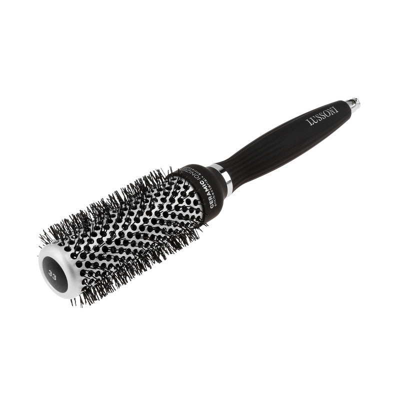 The Lussoni hot volume styling hairbrush was created to meet the needs of every professional who uses styling hairbrushes. At the design and production stage, we cooperated with hairdressers and hair stylists to ensure that every detail was refined to perfection. The round ventilated design with a diameter of 33mm helps dry hair faster. The waved bristles effectively protect hair from damage and accelerate the styling of long and very long hair. The antistatic, ionizing and antibacterial properties of the ceramic coating allow for a faster and even heat distribution making it resistant to very high temperatures up to 220 degrees Celsius. Its removable pin allows easy separation of hair strands and compartments.