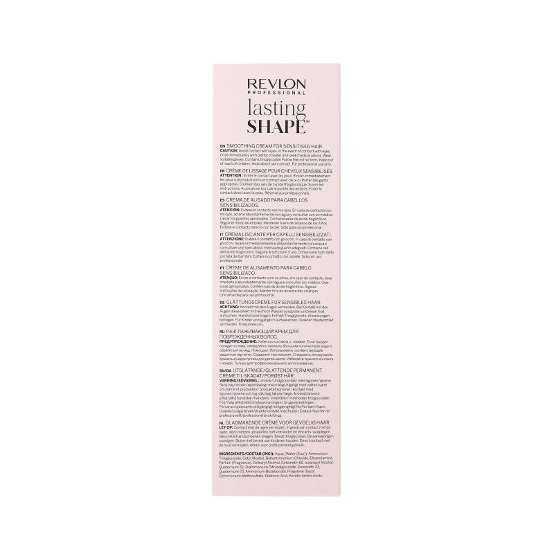 Revlon Professional Lasting Shape Smooth is an advanced smoothing system designed for professional hair straightening. Thanks to its innovative formula with Ammonium Thioglycolate and Keratin Amino Acids , the product effectively smoothes hair, reduces its volume and gives it a silky smoothness, while maintaining its natural elasticity. The product is intended for use in hairdressing salons. Ideal for sensitive, thin and sensitized hair.