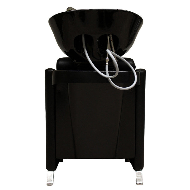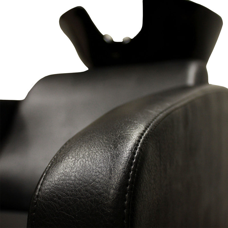 Luxor is a functional washbasin with a footrest, suitable for people of all height. The backrest of the washbasin is anatomically shaped, so that the customer obtains a particularly good posture. The mechanically lifted footrest completes the pleasant moment of relaxation. The tilting ceramic washbasin and stylish chrome legs facilitate the work of the hairdresser. The smooth black arelan upholstery is resistant to dirt. The washbasin is available with a traditional tap and an anti -drop shower system. The water parts are certified by the EU.