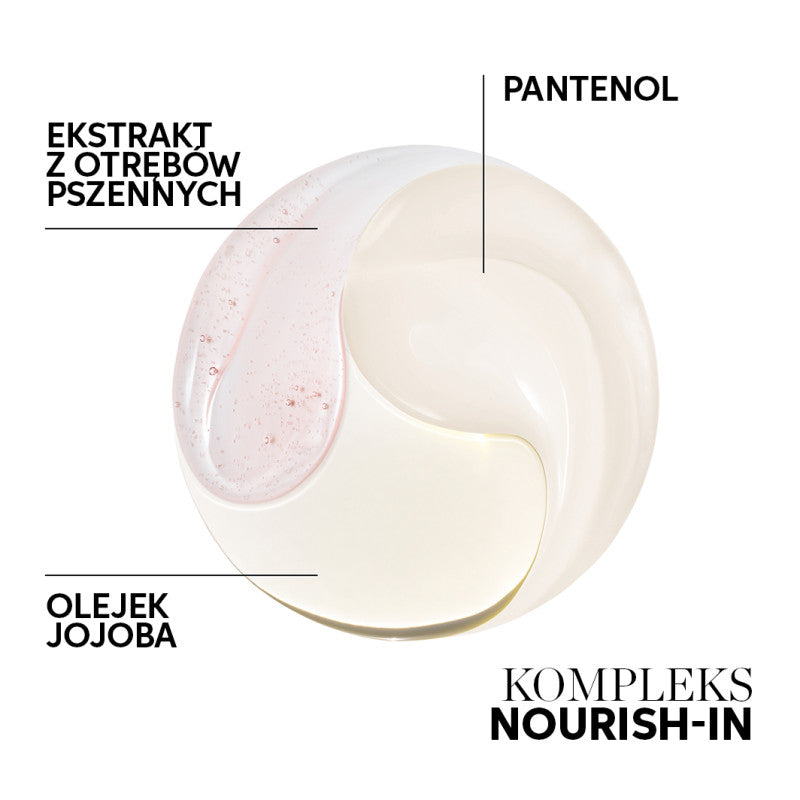 Contains the Nourish-In Complex formula rich in jojoba oil and wheat bran extract. Jojoba oil moisturises and nourishes hair to protect it against moisture loss. It also emphasises its natural shine. In addition, wheat bran extract rich in vitamins A and E strengthens hair and has antioxidant properties.