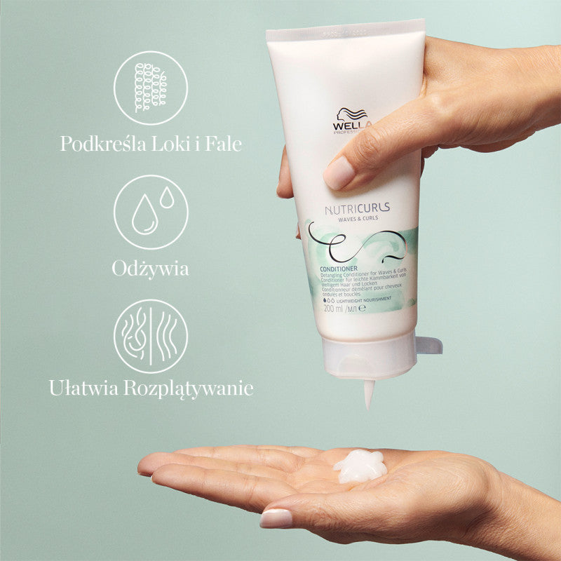 Wella Nutricurls conditioner for curly and wavy hair. Its gentle formula can be used both on curls and waves without burdening them. Its main task is to facilitate detangling. Like all Nutricurls products, it includes the Nourish-In Complex.