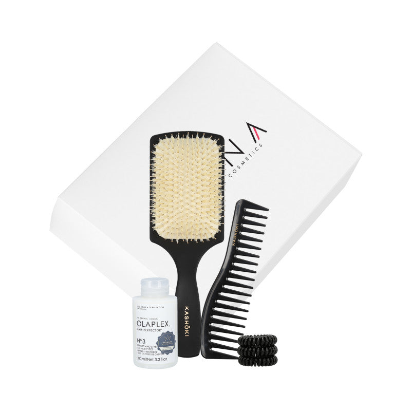 Szukasz idealnego prezentu dla bliskiej osoby? Podaruj jej zestaw produktów, który zagwarantuje jej piękne włosy pełne blasku. „Akcja regeneracja” to komplet najwyższej jakości produktów, w skład którego wchodzą: Kashōki Smooth White Detangler – wyjątkowo delikatna dla pukli szczotka ze szlachetnym, białym włosiem dzika, Wzmacniająca kuracja do włosów No.3 Hair Perfector profesjonalnej marki Olaplex, ułatwiający stylizację Grzebień Kashōki Sachikooraz niezwykle wytrzymałe Gumki Invisibobble Power. Kosmetyki zawarte w komplecie zapewniają kuszący efekt zdrowo wyglądających kosmyków. Taki zestaw trafi w gusta nawet najbardziej wymagających osób.