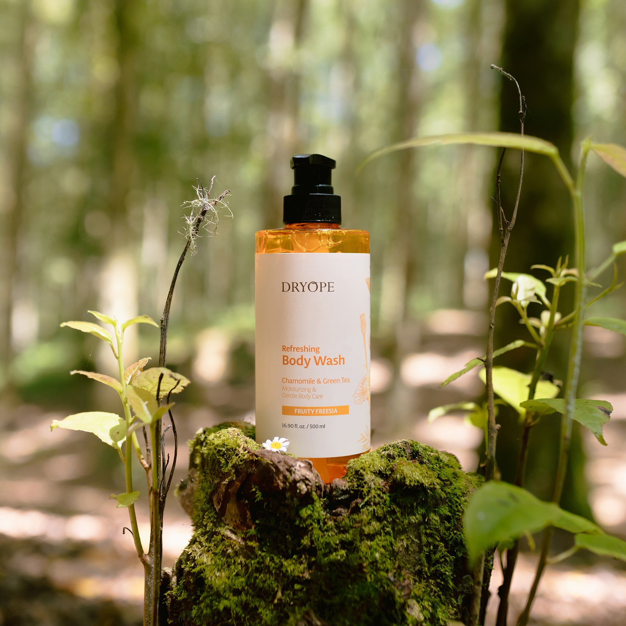 DRYOPE Refreshing Body Wash Fruity Freesia to wyjątkowy, wegański żel pod prysznic, który łączy skuteczne oczyszczanie ze zmysłowym zapachem frezji i owoców. Zawiera 10 000 ppm ekstraktu z rumianku i zielonej herbaty, które łagodzą i nawilżają skórę.