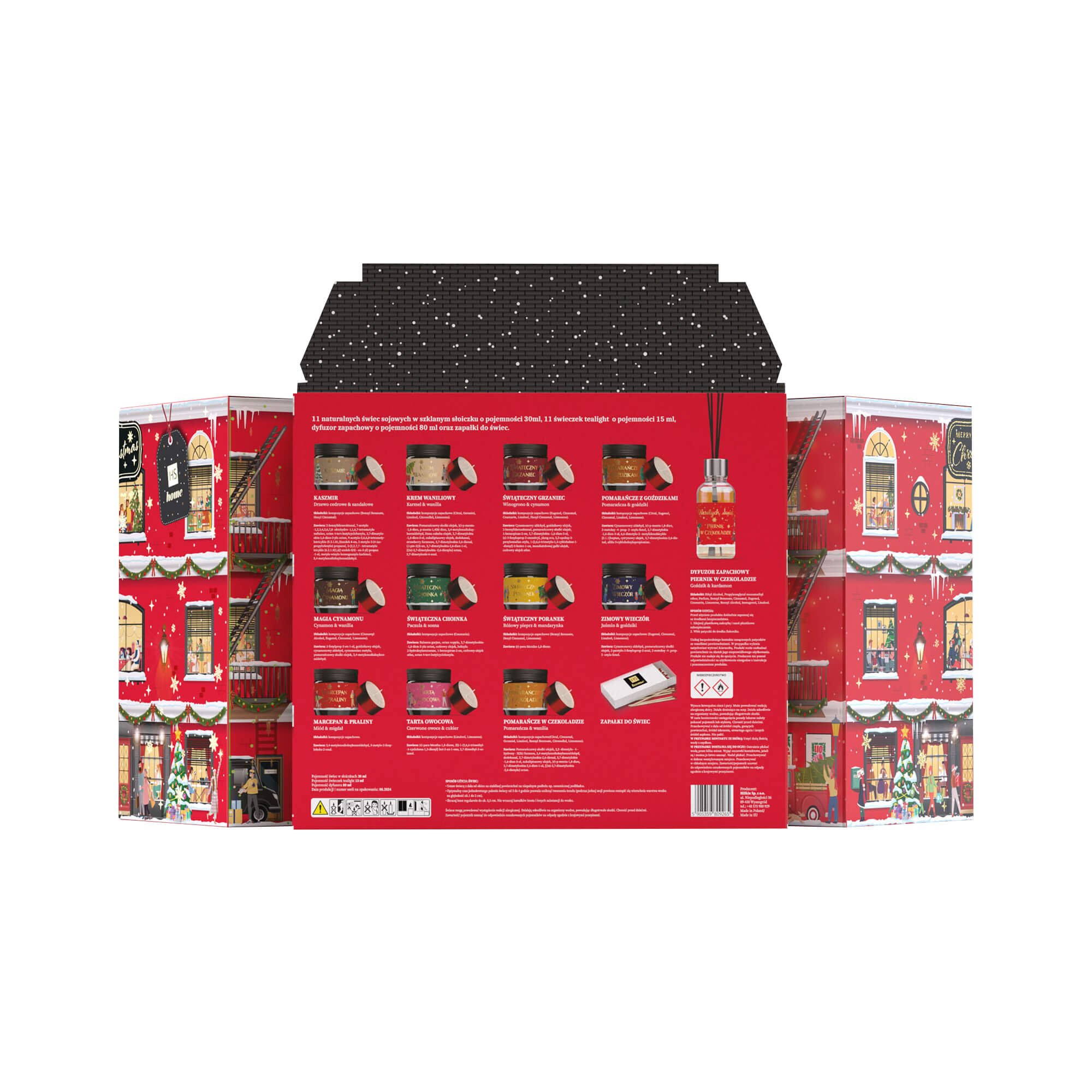 Kalendarz zawiera 12 świeczek typu tealight o pojemności 15ml, oraz 12 świec w szklanych pojemniczkach o pojemności 30ml