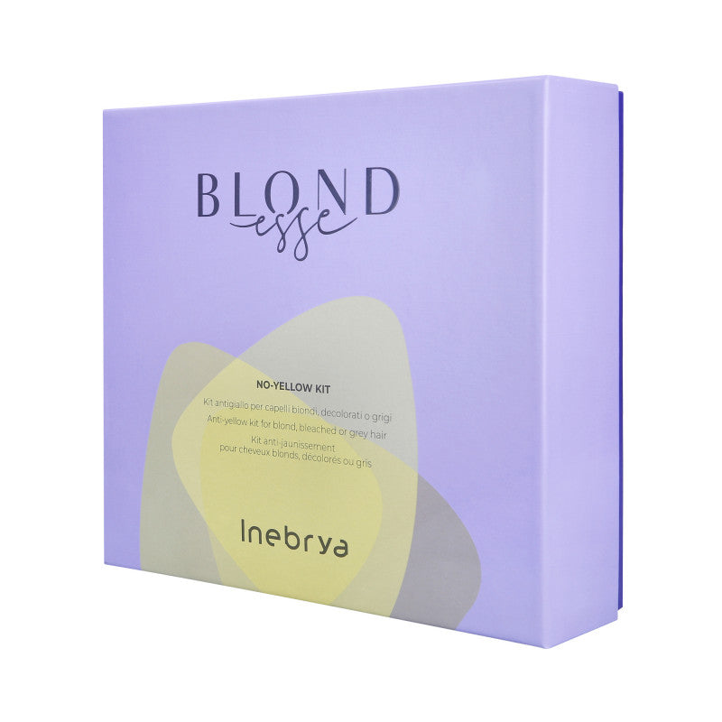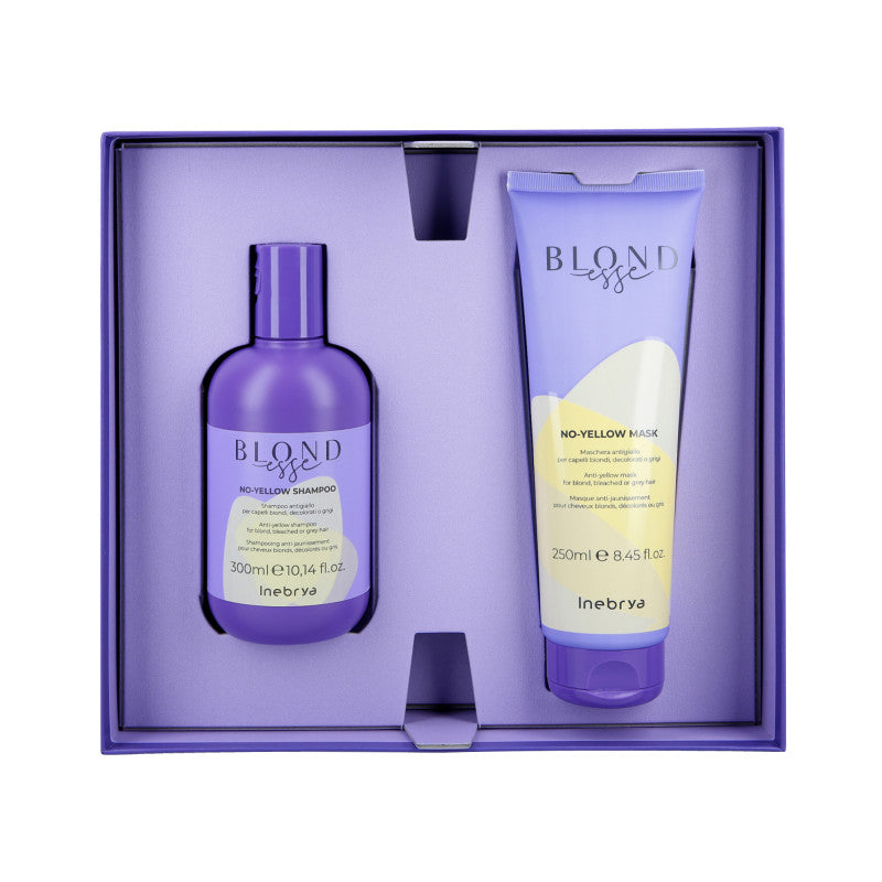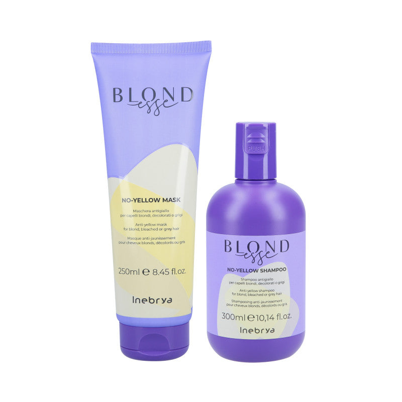 Zestaw Inebrya No Yellow zawiera szampon i maskę przeznaczonych dla włosów blond, rozjaśnianych i siwych, które potrzebują stonowania i neutralizacji żółtych odcieni.