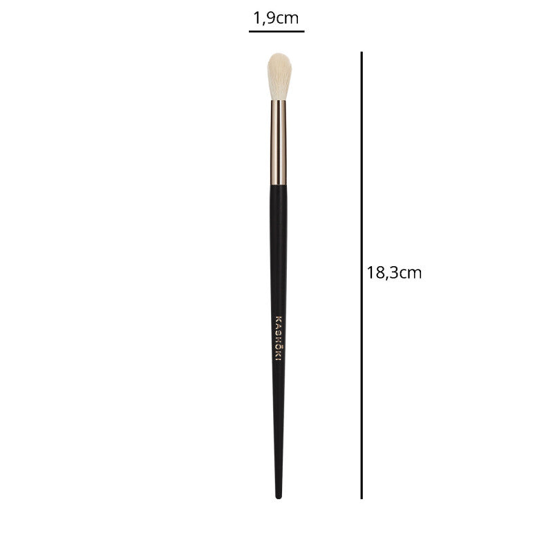 Duży pędzel do blendowania. Lekko zaostrzony kształt pędzla umożliwia precyzyjne zacieranie granic między odcieniami. Najwyższej jakości naturalne włosie kozy nie podrażnia delikatnej skóry powiek nawet w czasie długotrwałego rozcierania cieni.Pędzel został wykonany ze szlachetnych materiałów, jak drewno, miedź i wysokogatunkowe włosie. Drewniana rączka i miedziana skuwka są odporne na odgniecenia, zarysowania i rdzę.