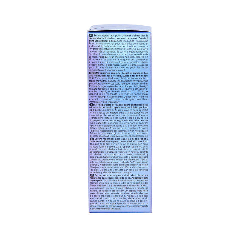 Lekkie, żelowe, przezroczyste serum z kwasem hialuronowym przeznaczone do regeneracji włosów blond oraz nawilża i ukojenia napiętej skóry głowy. Serum natychmiast nawilża włosy bezpośrednio po zabiegu rozjaśniania, jednocześnie koi skórę głowy i zachowuje hydro barierę skóry głowy. Serum jest najskuteczniejsze, gdy jest stosowane na mokre, osuszone ręcznikiem włosy, aby aktywować działanie kwasu hialuronowego. Czysty 2% kwas hialuronowy nawilża i odbudowuje rozjaśnione włosy blond. Odbudowuje uszkodzenia włókna włosa spowodowane zabiegiem rozjaśniania już po pierwszym użyciu, pozostawiając włosy o 95% mocniejsze. Serum nie zawiera parabenów i silikonów, a dzięki przyjemnemu zapachowi kwitnących kwiatów i cytrusowych nut doskonale pielęgnuje rozjaśnione blond włosy.