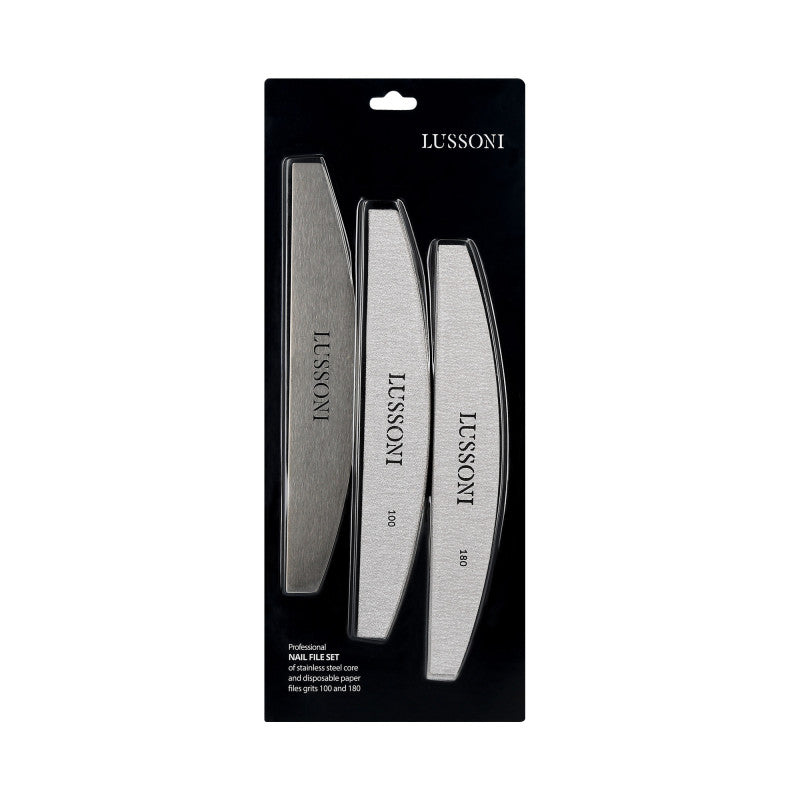 Zestaw Lussoni składa się z profesjonalnej bazy do naklejania papierowych pilników do paznokci, 5 jednorazowych, samoprzylepnych pilników o gradacji 100 oraz 5 pilników o gradacji 180. Baza Lussoni jest trwała i może być użytkowana przez długi czas. Zapewnia higienę podczas wykonywania manicure.