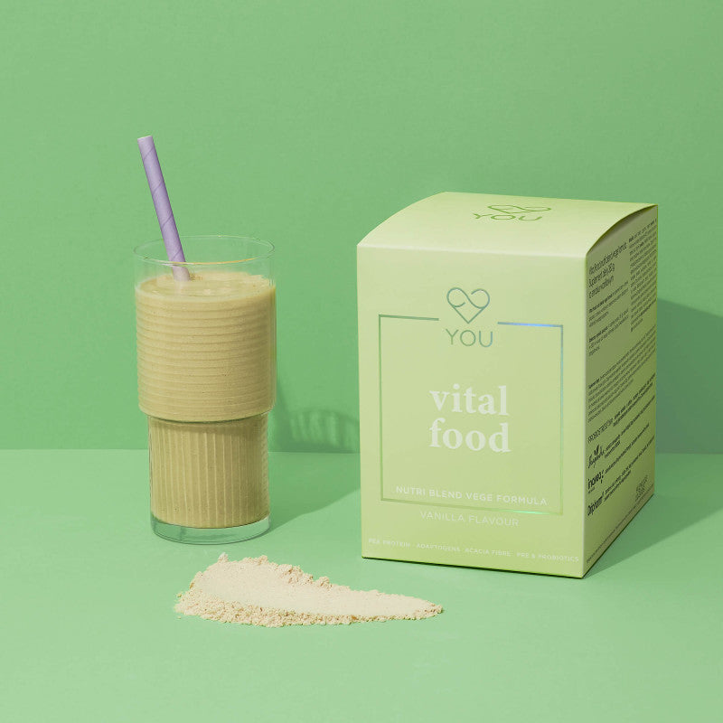YOU VITAL FOOD NUTRI BLEND VEGE PROTEIN FORMULA to coś więcej niż wegańska odżywka białkowa bez dodatku cukru. Zawiera białko (izolat białka grochu) które wspiera rozwój i utrzymanie masy mięśniowej, mąkę owsianą dla zrównoważonej energii, olej kokosowy o właściwościach odżywczych, ekstrakt z owoców aceroli, oraz opatentowane składniki takie jak: Probiostress®zen (redukcja stresu i poprawa jakości snu), Shagandha® (redukcja poziomu stresu), Inavea™ (właściwości prebiotyczne i wysoka tolerancja trawienna), Diphorm® (bogate źródło kwasów omega-3).