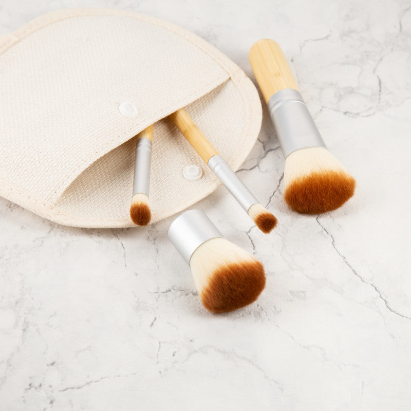 Zestaw 4 ekologicznych mini pędzli z włosia syntetycznego z bambusową rączką. Syntetyczne włosie nie wchłania kosmetyków, nie odkształca się i jest łatwe do utrzymania czystości. Z wykorzystaniem pędzli zawartych w zestawie stworzysz perfekcyjny makijaż, który ukryje niedoskonałości cery i podkreśli jej atuty. Do zestawu dołączono bawełniane etui.