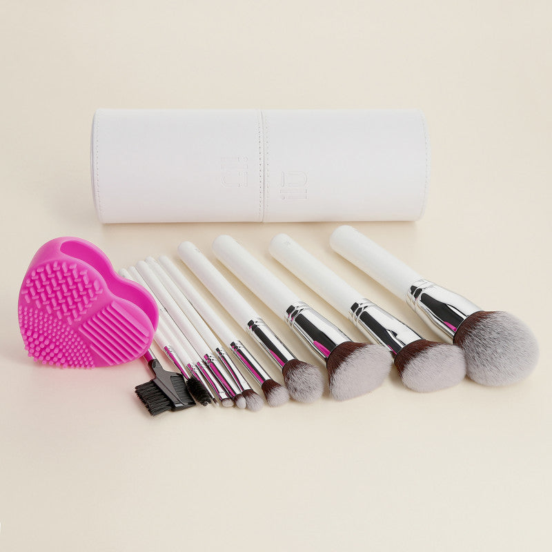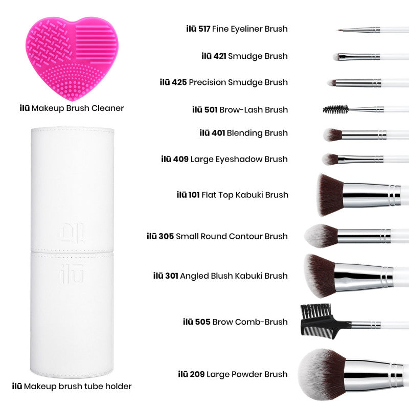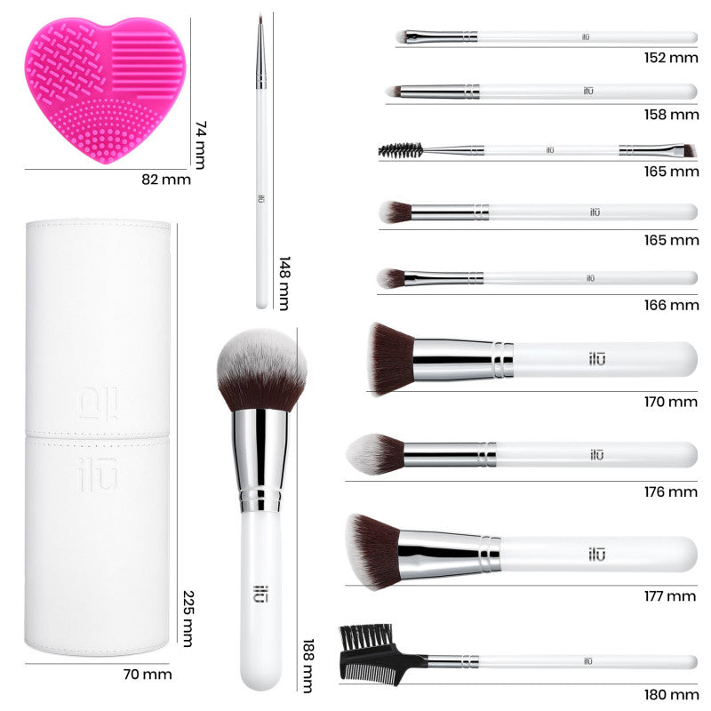 Zestaw ilū Expert Touch zawiera wszystko czego potrzebujesz żeby stworzyć kompletny makijaż dzienny lub wieczorowy. Znajdziesz tu 11 pędzli do twarzy, do konturowania oraz do makijażu oczu. Dołączony do zestawu czyścik pomoże utrzymać pędzle w nienagannym stanie. A ponieważ szczęścia nigdy nie jest za dużo, do zestawu dołączamy elegancką tubę na pędzle!